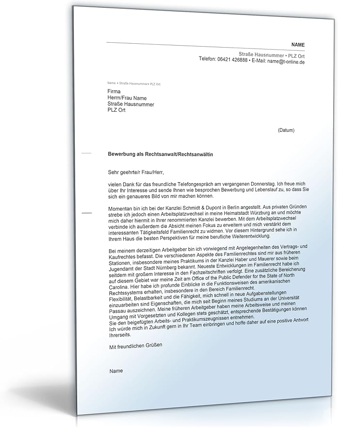 Anschreiben bewerbung rechtsanwalt. Dementsprechend ist es wichtig sich seriös zu präsentieren. Herrn rechtsanwalt gruber persönlich am großen garten 3 30167 hannover. Die vorlage lässt sich beliebig ihren persönlichen wünschen anpassen. Teilte brak dann in eine pressemitteilung mit sie werde die bea plattform vorerst offline.