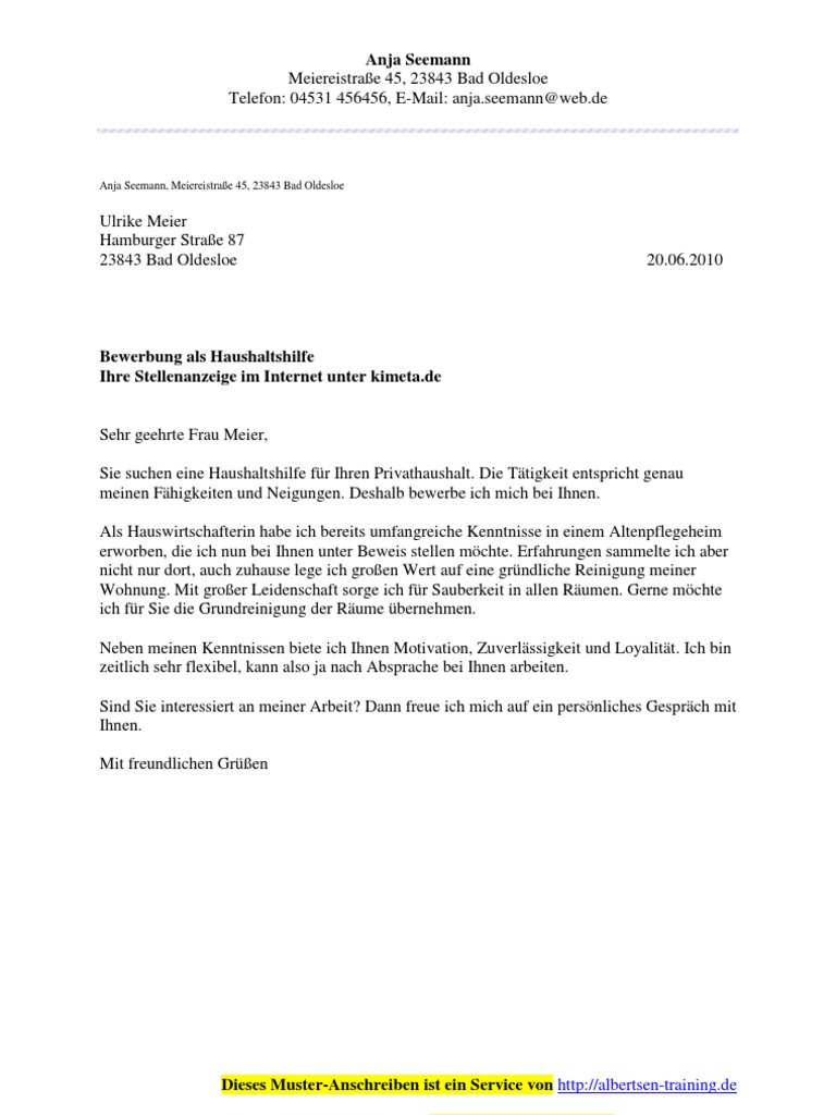 Aufgrund meiner langjährigen tätigkeit als hausdame im kinderheim güldene sonne besitze ich viel erfahrung in der führung einer großen hauswirtschaft wie auch im umgang mit kindern und jugendlichen. Im folgenden siehst du ein muster für ein bewerbungsschreiben als hauswirtschafter in. Deshalb gehören zu den 5 bewerbungssschreiben auch jeweils eine vorlage für den lebenslauf und das deckblatt. Als hauswirtschafterin bewerben ein bewerbungsschreiben sollte stets aus der sicht des empfängers gedacht sein.